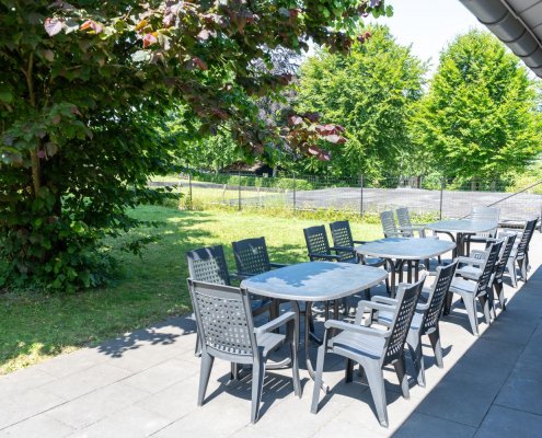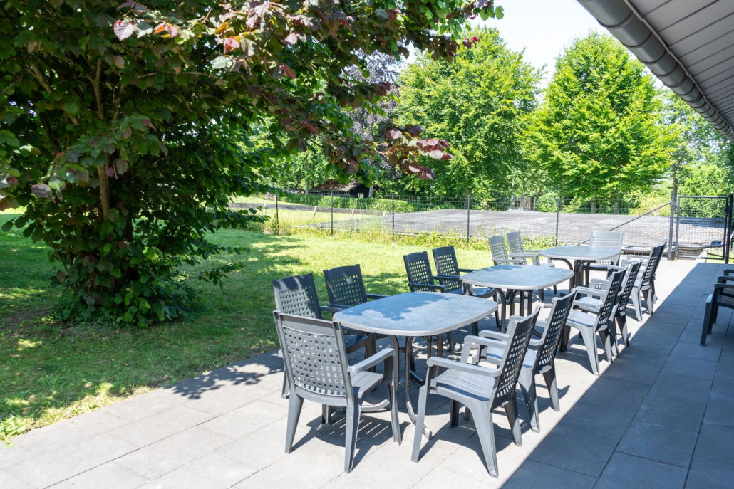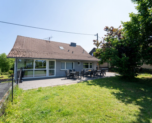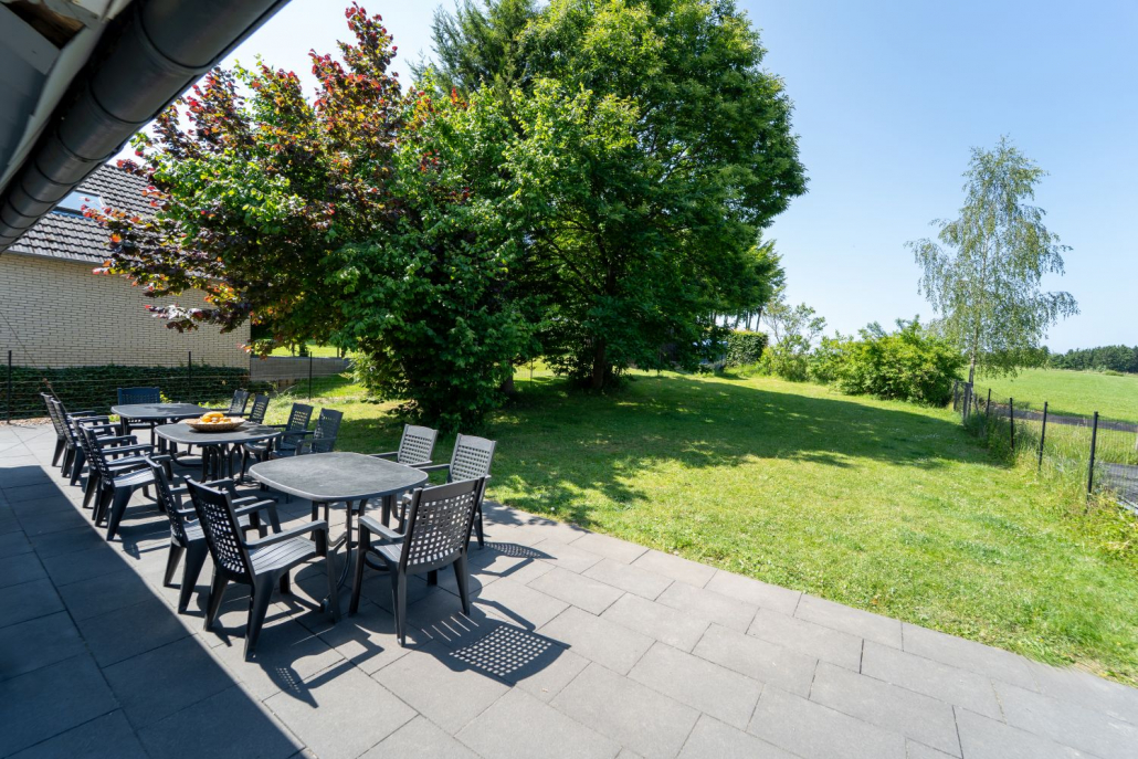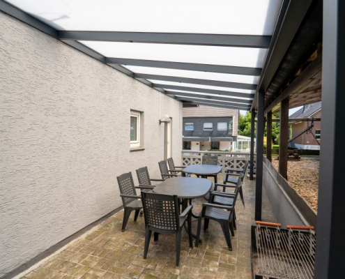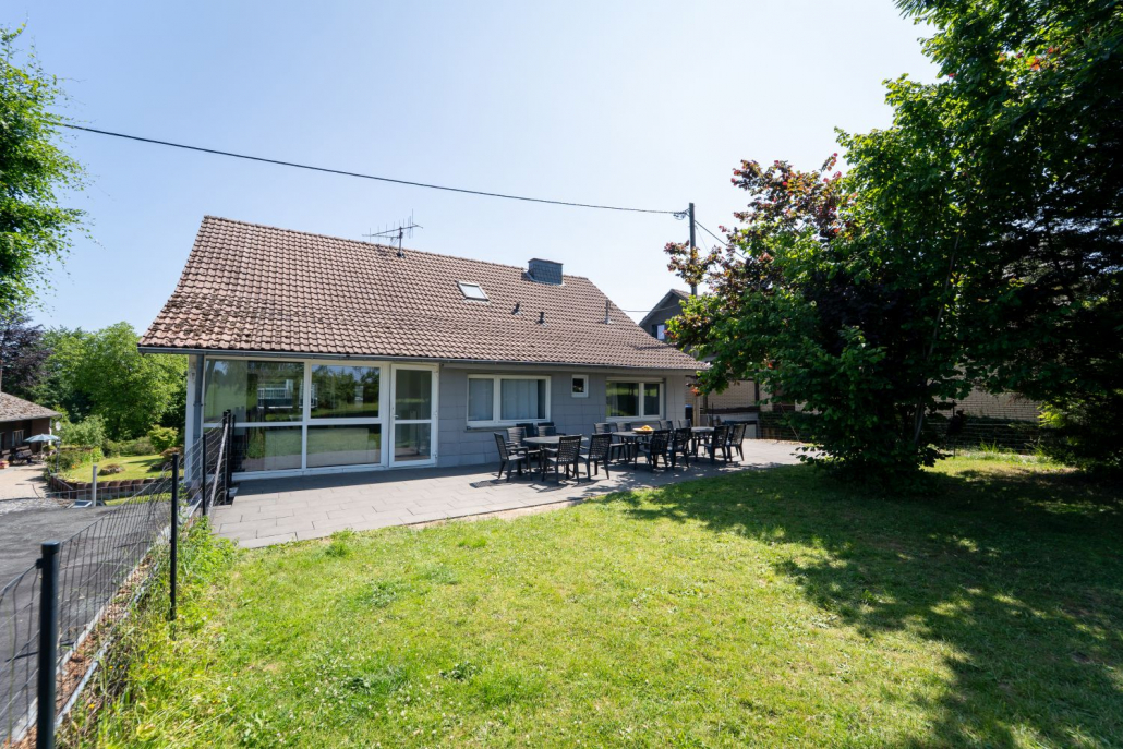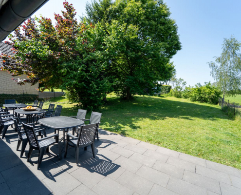 Die Terrasse hinter dem Haus ist mit Gartenmöbeln für 20 Personen bestückt. Ein Teil der Terrasse wurde im Frühjahr 2025 überdacht. Es gibt 8 Parkplätze am Haus, in Monschau eher eine Seltenheit.