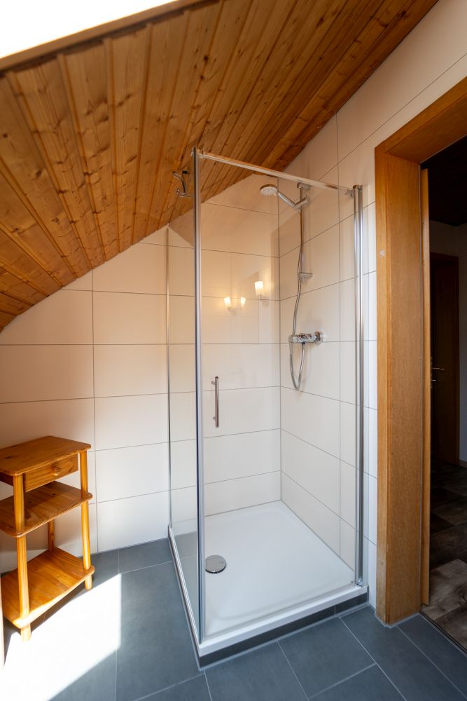 Der helle Wohn- und Essbereich mit Blick über die Wiesen bis zum Waldrand, ist mit großzügigen Tischen und ausreichend Sitzplätzen für 20 Personen eingerichtet. Ein 1,30m großer Sat-TV und ein Radio mit CD- Spieler sind ebenfalls im Wohn und Eßbereich aufgestellt. Drei weitere TV-Geräte sind in drei Schlafzimmern angebracht.